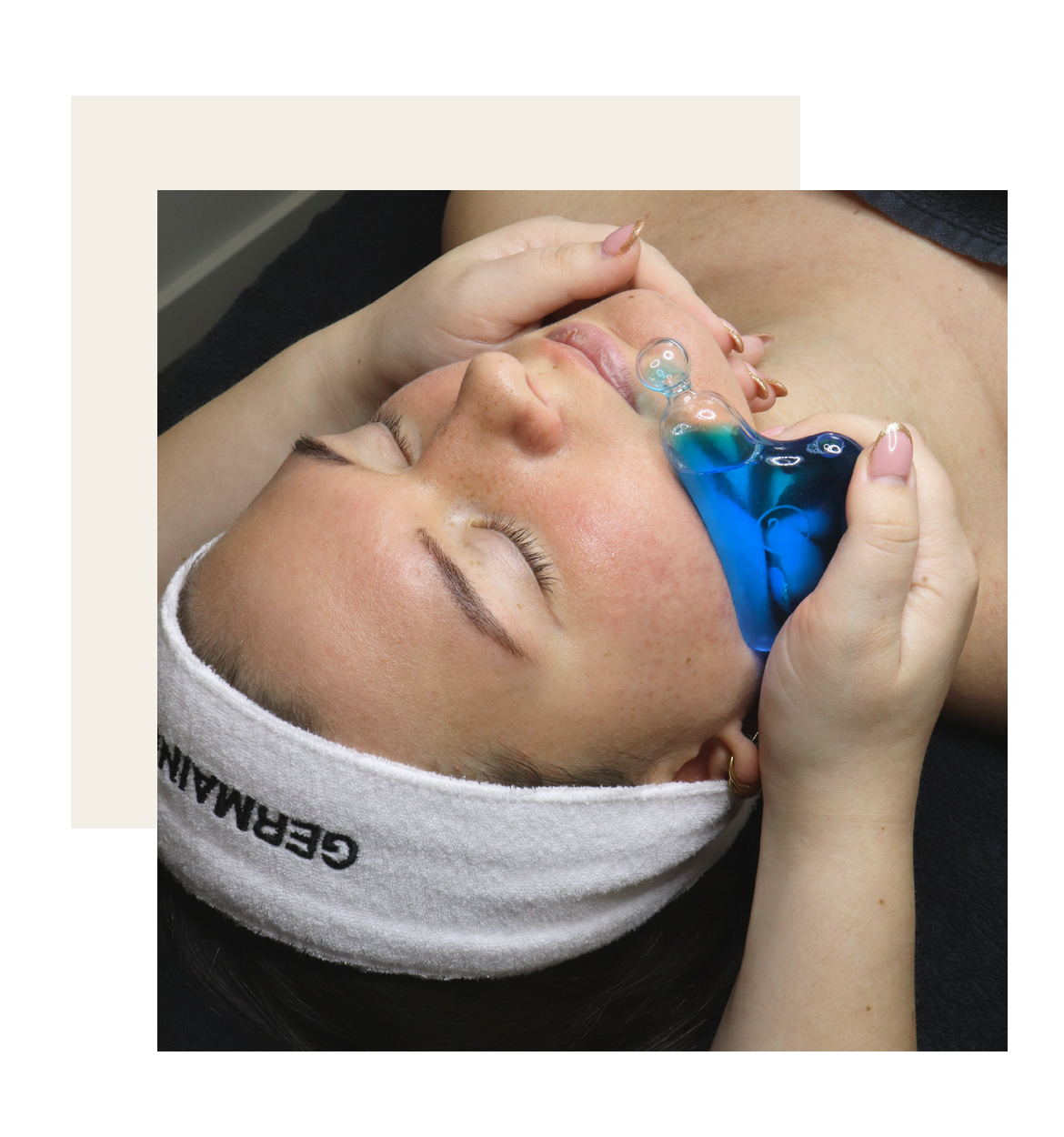 Het gelaat word gereinigd, hierna brengen we een plumping gelaatsconcentraat aan, dit gaat vooral inwerken op de droogtelijntjes en rimpels. Hierna masseren we het gelaat met een mengsel van het plumping concentraat en de oleo-gel 3HZ+. Bij de massage maken we gebruik van de cool massager. Dit is een tool waarmee we de huid ontzwellen en afvalstoffen gaan afvoeren. doordat we de tool tussendoor afkoelen blijft hij de huid activeren om rimpeltjes te verminderen en een frisse glow te bekomen. Ook krijgen we door het gebruik van deze tool strakkere gezichtscontouren en een meer elastische huid. Op het einde van de massage werken we vooral op het afvoeren van de afvalstoffen die in de huid vrij zijn gekomen door de behadeling. Na de massage brengen we het extra hydraterende gelaatsmasker aan. We sluiterl af met een dagcreme aangepast aan het huidtype van de klant.